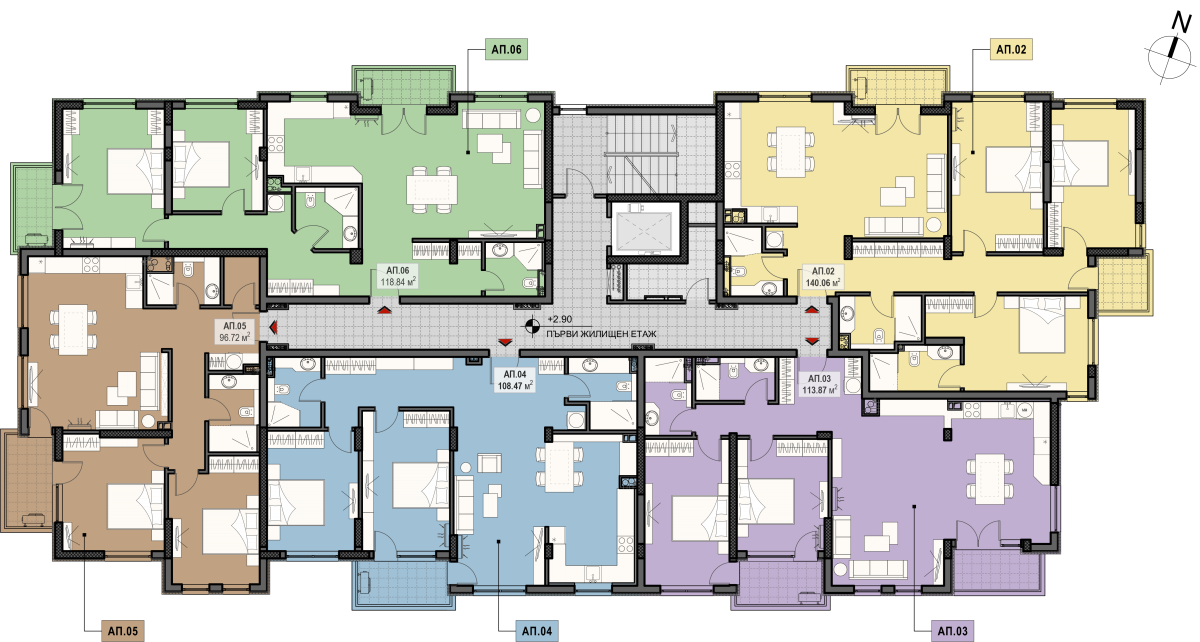 | Ap. 2 | Четиристаен апартамент | 164.29 кв. м. | 140.06 кв. м. | 24.23 кв. м. |